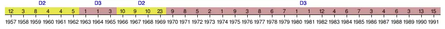 | 1982 | 12e | 25 | 28 | 9 | 7 | 12 | 29 | 32 | -3 | — | |