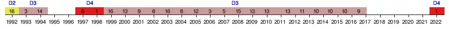 | 2005 | 12e | 42-6 | 36 | 13 | 9 | 14 | 40 | 45 | -5 | 256es de finale | |