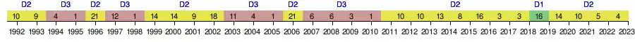 | 2015-2016 | 16e | 44 | 38 | 11 | 11 | 16 | 37 | 47 | -10 | Seizièmes de finale | |