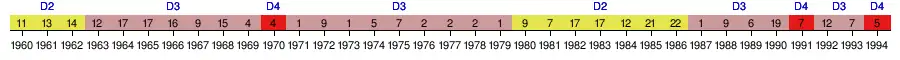 | 1969 | 4e | 40 | 32 | 13 | 14 | 5 | 42 | 21 | +21 | — | |