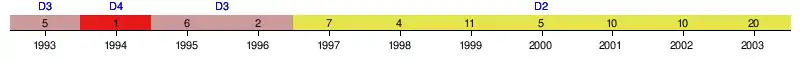 | 1995 | 3e Ouest | 6e | 77 | 42 | 23 | 8 | 11 | 58 | 35 | -23 | Troisième tour |
