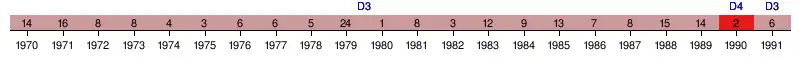 | 1989 | 14e | 40 | 42 | 14 | 12 | 16 | 46 | 42 | +4 | ||