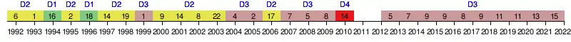 | 1995 | 2e | 2e | 79 | 42 | 25 | 4 | 13 | 67 | 39 | +25 | Seizièmes de finale |
