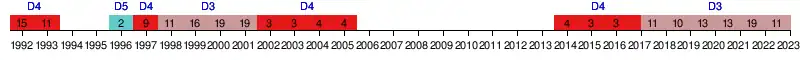 | 1997 | 4e Ouest | 9e | 53 | 36 | 13 | 14 | 9 | 43 | 36 | +7 | |