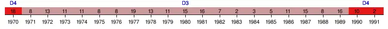 | 1977 | 3e Zone 5 | 19e | 33 | 40 | 13 | 7 | 20 | 46 | 50 | -4 | |