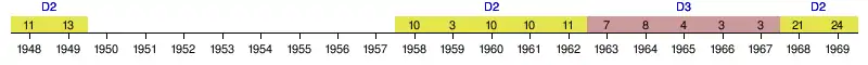| 1949 | 13e | 14 | 26 | 4 | 6 | 16 | 24 | 61 | -37 | Deuxième tour Q | |