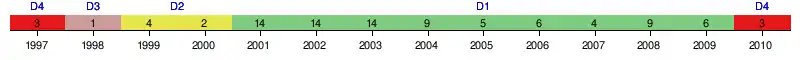 | 2001 | 1re | 14e | 31 | 30 | 7 | 10 | 13 | 22 | 35 | -13 | Cinquième tour | ||