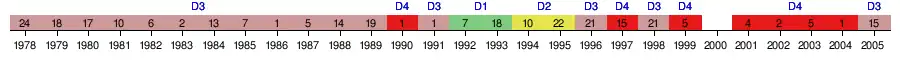| 1978 | 3e Zone 1 | 24e | 16 | 46 | 4 | 8 | 34 | 25 | 76 | -51 | — |