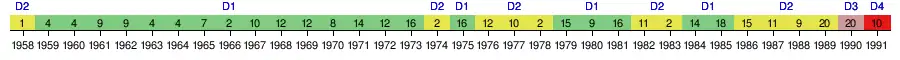 | 1981 | 16e | 26 | 34 | 8 | 10 | 16 | 39 | 58 | -19 | Vainqueur | |