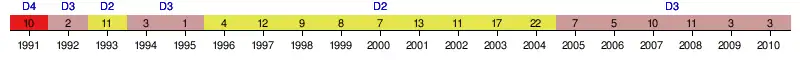 | 1998 | 9e | 63 | 42 | 18 | 6 | 18 | 53 | 58 | -5 | Deuxième tour | |