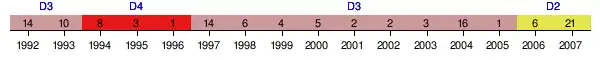| 2005 | 1er | 101 | 36 | 33 | 2 | 1 | 108 | 19 | +89 | Seizièmes de finale | |