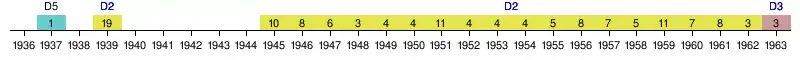 | 1945 | 2e | 10e | 15 | 17 | 7 | 1 | 9 | 23 | 32 | -9 | Huitièmes de finale |