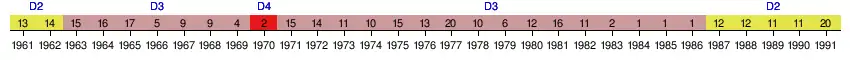 | 1980 | 3e Zone 2 | 12e | 32 | 34 | 14 | 4 | 16 | 42 | 43 | -1 | |