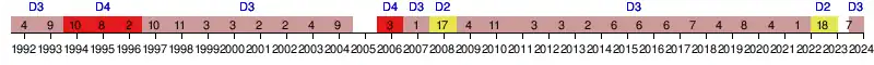 | 1990 | 3e Ouest | 16e | 37 | 42 | 12 | 13 | 17 | 34 | 45 | -11 | |