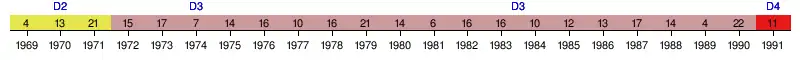 | 1975 | 3e Zone 3 | 14e | 31 | 38 | 10 | 11 | 17 | 40 | 46 | -6 | |