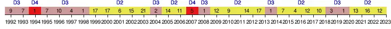 | 2009 | 2e | 12e | 51 | 38 | 12 | 15 | 11 | 40 | 41 | -1 | 32es de finale |