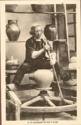 Fouillen : Paul (1899-1958) arrive au début des années 1920 à Quimper et entre au service de la Grande Maison HB. Quelques années plus tard, il crée un atelier de décoration rue basse (actuelle rue Bousquet), il y travaille le bois, cuir et le verre, tout en gardant son emploi à la faïencerie. Son travail de décorateur est cité dans la presse dès 1926, même s'il ne s'enregistre officiellement qu'en 1927. Fin 1928, il achète l'ancienne guinguette Le Gall, située à l'angle de la place du Styvel et de la rue Basse. Il y installe ses ateliers de décoration. C'est à cette période qu'il aurait quitté la faïencerie HB. Il renoue avec la faïence à l'aube des années 1940, décorant des pièces chez Henriot. En 1945 il crée sa propre faïencerie en lieu et place de ses ateliers[4]. Sa production est caractérisée par des sujets bretonnants bien typés, ainsi que par une profusion de motifs stylisés appartenant au répertoire celtique : des pièces hautes en polychromie et extrêmement originales. Son fils Maurice, en 1980, doit se séparer de ses ouvriers mais continue à assurer, seul, une petite production.