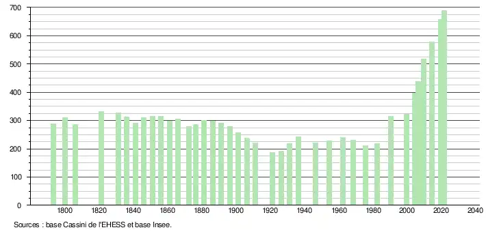 - Population municipale légale en vigueur au 1er janvier 2024, millésimée 2021, définie dans les limites territoriales en vigueur au 1er janvier 2023, date de référence statistique : 1er janvier 2021.