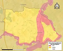Le retrait-gonflement des sols argileux est susceptible d'engendrer des dommages importants aux bâtiments en cas d’alternance de périodes de sécheresse et de pluie. La totalité de la commune est en aléa moyen ou fort (92 % au niveau départemental et 48,5 % au niveau national). Sur les 242 bâtiments dénombrés sur la commune en 2019, 242 sont en aléa moyen ou fort, soit 100 %, à comparer aux 96 % au niveau départemental et 54 % au niveau national. Une cartographie de l'exposition du territoire national au retrait gonflement des sols argileux est disponible sur le site du BRGM[25],[Carte 3].