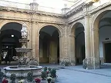 C'est à l’intérieur de l'édifice que se manifeste le mieux l'adéquation entre le bâtiment et ses fonctions originelles. Les quatre portails, placés au centre des différentes façades, s'ouvrent sur des couloirs, qui se rejoignent au niveau principal et structurent ainsi la fabrique selon un plan cruciforme. L'ensemble de l'édifice s'articule autour de trois vastes patios et de galeries qui donnent accès aux différentes salles. Le volume de ces couloirs et de ces cours surprend par sa monumentalité. Le patio principal se distingue par ses dimensions et sa belle facture néoclassique. Entouré de volumineuses galeries à arcs en plein-cintre, il est égayé en son centre par une ravissante fontaine baroque[11]. Deux petits patios, plus intimistes, sont également construits dans l'aile nord-ouest de l'édifice et disposent également de fontaines. De nombreux espaces ont été réhabilités afin de permettre leur utilisation dans le cadre universitaire : bureaux, salles de classe, amphithéâtres et bibliothèques ont remplacé les anciens ateliers.