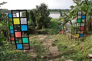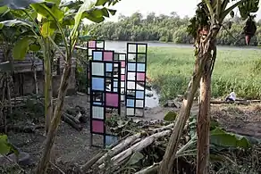 Face à l’eau est une installation située dans une aire de passage sur les berges du fleuve Wouri à Bonamouti. Elle est constituée de cinq panneaux verticaux, en bois, métal et tôles plastiques colorés. Erigés à 3,70 m de hauteur pour les plus importants, ces cinq ‘volets’ désolidarisés sont disposés sur la berge de façon qu’à une certaine distance, ils créent l’illusion d’un paravent unique. L’installation est conçue dans l’optique de protéger des regards des promeneurs la nudité des piroguiers-pêcheurs qui se lavent à l’issue de leur journée de travail.
