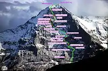 - Directissime (voie Harlin) : mars 1966 par John Harlin (qui y meurt), Dougal Haston et Layton Kor ; première hivernale de cette voie en 1970 par une grosse équipe japonaise avec de nombreuses cordes fixes ; première hivernale solitaire le 16 janvier 1990 par Slavko Sveticic en s'aidant beaucoup des cordes fixes[4].