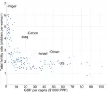 L'augmentation des revenus et le développement humain sont généralement associés à une baisse des taux de fécondité[36]. Les théories économiques sur la baisse de la fécondité postulent que les personnes qui gagnent plus ont un coût de renoncement plus élevé si elles se concentrent sur l'accouchement et l'éducation des enfants plutôt que sur la poursuite de leur carrière[1], que les femmes qui peuvent subvenir à leurs besoins économiques sont moins incitées à se marier[1], et que les parents qui ont des revenus plus élevés privilégient la qualité à la quantité et consacrent donc leurs ressources à moins d'enfants[1].
