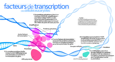 Les facteurs de transcription sont des activateurs ou des répresseurs du complexe transcriptionnel constitué autour de l'ARN polymérase qui agissent en se fixant sur les séquences régulatrices en amont des gènes à transcrire. De manière indirecte, par le recrutement de corégulateurs transcriptionnels, ils peuvent agir sur l'état de condensation de la chromatine en acétylant ou désacétylant spécifiquement certains résidus lysines des histones ce qui a, sur le mécanisme de la transcription, des effets respectivement activateur ou répresseur.