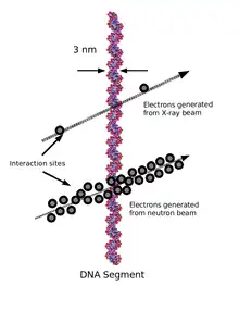 L'étude de l'effet des rayonnements ionisants sur les dommages de l'ADN montre que les dommages constatés sont de même nature que ceux que subissent spontanément les cellules, mais dans des proportions différentes. L'exposition d'une cellule à des rayonnements ionisants créé moins de lésions isolées et davantage de groupes de lésions (lésions en grappe), ce qui augmente la proportion de cassures double brin et de ponts ADN/ADN et ADN/protéine[71].