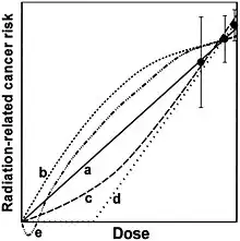 À partir des données sur les survivants des bombardements atomiques au Japon, il a été statistiquement établi qu'une exposition à un rayonnement de 2 sieverts (rayonnement gamma, uniformément réparti sur le corps, et reçu en quelques secondes) conduit à doubler le risque de mourir d'un cancer, c'est-à-dire engendre un « risque relatif » de deux[66]. C'est ce chiffre, associé à l'idée d'une relation linéaire entre dose et effet, qui est à la base de la « règle » qu'une exposition à 100 mSv conduit à un risque relatif de 1.05, ou encore (du fait que le risque « naturel » est de l'ordre de 20 %) qu'une exposition à 100 mSv entraîne une probabilité de 1 % de provoquer un cancer.