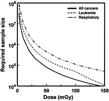 Ainsi, sur la base du modèle linéaire sans seuil, 500 personnes exposées suffisent , théoriquement, à détecter (8 fois sur 10) les effets d'une dose de 1 000 mSv. Pour détecter les effets d'une dose dix fois moindre (100 mSv),il faut une population exposée d'au moins 50 000 personnes. Et pour 10 mSv il faudrait une cohorte 100 fois plus grande (soit 5 millions de personnes exposées)[18].