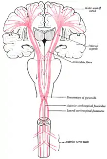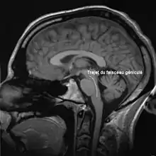 Il descend dans le tiers interne du mésencéphale et abandonne ses fibres aux noyaux moteurs des nerfs crâniens. Il distribue ses fibres de manière bilatérale pour l'ensemble des nerfs crâniens à l'exception du noyau du nerf VII inférieur pour lequel les fibres sont distribuées de manière controlatérale seulement[1]. Ce qui explique qu'une lésion centrale (cortex) unilatérale s'exprime cliniquement en cas d'atteinte du VII inférieur par une faiblesse des muscles de la partie inférieure du visage (sous les yeux) controlatérale à la lésion. Par exemple, une atteinte de la partie moteur du cortex frontal gauche entraîne l'affaissement de la commissure labiale droite.