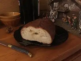Cette brioche n'est pas moulée mais façonnée en forme d'ovale et entaillée aux ciseaux sur le dessus pour lui donner une forme de chapeau.