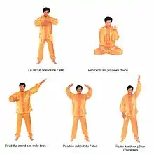 Le premier exercice, appelé « Bouddha étend ses mille bras », est destiné à faciliter la libre circulation de l'énergie dans le corps et à ouvrir les méridiens. Le second exercice, « Position debout du Falun », consiste en quatre postures statiques, chacune similaire à la tenue d’une roue invisible, pendant une période de temps prolongée. L'objectif de cet exercice est d’augmenter le niveau d’énergie. Le troisième, « Relier les deux pôles cosmiques », comporte trois séries de mouvements permettant d'expulser la mauvaise énergie du corps (par exemple, l’énergie pathogène ou qi noir) et la remplacer par de la bonne énergie. Grâce à la pratique de cet exercice, le pratiquant est censé nettoyer et purifier son corps. Le quatrième exercice, « Le circuit céleste du Falun », vise à faire circuler l'énergie librement dans tout le corps. Contrairement aux quatre premiers, le cinquième exercice est effectué assis en position du lotus ou du demi-lotus pour les débutants. Appelé « Renforcer les pouvoirs divins », c'est une méditation destinée à être maintenue aussi longtemps que possible et il est considéré par Li Hongzhi comme l'exercice le plus avancé[27].