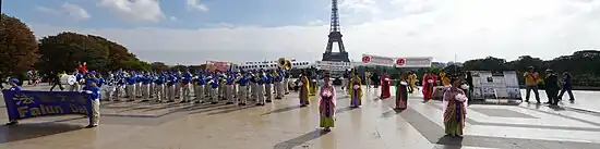159. Antoine Paoli, « Politique Internationale », (consulté le ) : « Quelques mois plus tard, le Falungong réapparaît sous une nouvelle forme : des manifestations sur la place Tien An Men, symbole de la république populaire de Chine. Les diverses fêtes du calendrier, à commencer par le 1er octobre 1999, jour de la fête nationale, constitueront autant d'occasions de se mobiliser. »