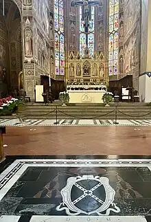 Armoiries Alberti au Palazzo Davanzati chambre des paons - Basilica di Santa Croce (Florence) : Depuis sa construction jusqu'au XVe siècle, la basilique était le tombeau de la famille Alberti. Ils ont obtenu ce droit d'inhumation pour avoir participé à la construction et à l'amélioration de la Basilique (Chapelle Majeure en 1348 et cycle de la Légende de la Vraie Croix en 1380). C'est ainsi qu'au sol, dans l'allée centrale, face au choeur se trouvent les armoiries Alberti. En outre, la basilique est le lieu de sépulture de certaines des personnalités italiennes les plus illustres, telles que Michel-Ange Buonarroti, Galileo Galilei, Niccolò Machiavelli, Vittorio Alfieri, Ugo Foscolo, Gioachino Rossini et Leon Battista Alberti. Près du dernier pilier de la nef gauche se trouve le cénotaphe de Leon Battista Alberti. Le monument néoclassique créé par Lorenzo Bartolini, commencé en 1838 et placé dans la basilique en 1851, représente l'Apothéose de Leon Battista Alberti : l'architecte, accueilli par un ange tenant une torche allumée, tend la main vers la divinité dans un acte de gratitude. L'architecte est accompagné d'un ange gardien aux pieds duquel se trouvent quelques livres sur lesquels repose la renommée d'Alberti.
