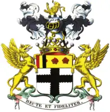 | Blasonnement | D'argent à la croix engrelée de sable à un chef d'or chargé de trois quintefeuilles de gueules et d'un franc-canton tiercé en pal de gueules d'or et de sable. Bourlet de sable et d'argent. Cimier: un lion issant d'or. Lambrequin d'argent et de sable. Supports: deux griffons d'or. | |