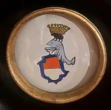 Blason surmonté d'un heaume et/ou d'une couronne comtale en référence au lignage présumé avec la Maison des Comtes et Seigneurs feudataires de La Rocca[15].
