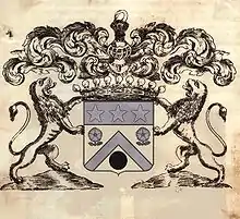 D’argent, au chevron d’azur, accompagné en chef de deux roses de gueules, tigées et feuillées de sinople, et en pointe d’une motte (alias tourteau) de sable ; au chef d’azur, chargé de trois étoiles d’or[2].
