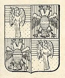 *2e et 3e de rouge à l'aigle bicéphale couronné d'or sur les deux têtes et chargé à la poitrine d'un bouclier d'azur à la bande d'or[1].