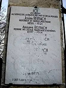- Adolphe Reinach (1887-1914), archéologue, helléniste et égyptologue, mobilisé pendant la Première Guerre mondiale, tué dans les Ardennes en 1914, époux de Marguerite, dite Magui Dreyfus (1890-1980), fille de Mathieu Dreyfus, père de :