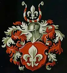 | Blasonnement | De gueules à une fleur-de-lis d'argent accompagnée en pointe d'un mont de trois coupeaux de sinople. |