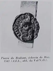 • 1° Pierre (le vieux), échevin de Huy et de Wanze (1541), membre du métier des vignerons, mayeur héréditaire de Waleffe-Saint-Pierre (1560), tenant de la Cour jurée de Notre-Dame des Carmes à Huy ; l’ancien château ferme et la seigneurie de Waleffe-Saint-Pierre étaient tenus par Henry d’Acosse, écuyer, époux de Catherine de Huy, grand-père de Marie d'Acosse.; Pierre de Brabant fut chargé avec le fourrier Antoine Mureau par le Prince-évêque Georges d’Autriche le 6 mai 1552 d’empêcher les gens de guerre de commettre des dégâts dans le pays et les chanoines tréfonciers de la Cathédrale le prièrent en 1560 de remettre la cour en activité[13], + 23 mai 1573, x Marie d'Acosse laquelle testa le 23 janvier 1582 et laissa divers biens à ses neveux, Pierre (le jeune), ainsi qu’à Godefroid et Charles de Brabant, enfants de Godefroid et Jeanne Menjoye, + 9 mars 1584, fille de Gilles et de Marie Bozea de Thiribu. Sans postérité. Pierre reçut une sépulture en l'église des Dames Blanches à Huy en armes, portant les quartiers Brabant - Sywalart - Acosse - Bozeal de Thiribu. Son épouse Marie fut inhumée dans une sépulture collective à Waleffe-Saint-Pierre où reposaient Henry d'Acosse jadis échevin de la cour de Wanze (+ 21 juillet 1507), Sibylle Sywalart, femme de de Jean V, (+ 21 septembre 1538), Pierre de Brabant (le jeune) et son épouse Jehenne de Remikette.