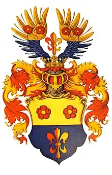 | Blasonnement | D’or à 2 roses à cinq feuilles de gueules boutonnées d’or; coupé d’azur à la fleur de lys partie de gueules et d’or | |