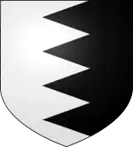 III. - Olivier II de Launay, fils de Marie de Landas, quitte le chevron de ses armes et gardant le cimier "une hure de sanglier", pour relever les armoiries de sa mère "émanché d'argent et de sable de 10 pièces"[4], ainsi qu'et le cri de guerre "Landas", devient seigneur de Lannay. On ignore le nom de sa femme. Il est père de :