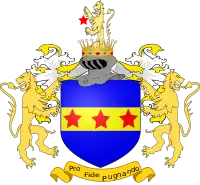 - Armes : D’azur, à la fasce d’or chargée de trois étoiles de gueules[1].