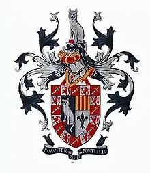 | Blasonnement | parti : à dextre, de sable à un chat d'argent assis, la tête posée de face, la patte avant dextre posée sur une souris de gueules; à senestre, d'argent à une fleur de lis de sable, au chef d'or à trois pals de gueules; à la bordure componée de seize pièces de gueules et d'argent, les compons de gueules chargés d'une épée d'argent et garnie d'or posée en barre, la pointe en bas, les compons d'argent chargés d'un lion issant de gueules, armé et lampassé d'azur. |