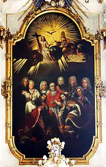 Le retable de l’autel de l'église paroissiale de Gaibach est un des emblèmes de la maison noble des Schönborn : on peut y voir représentées trois générations de princes ayant servi dans des charges temporelles ou spirituelles (les insignes au premier plan indiquent les autorités qu'ils ont servies : l'Église d'Allemagne, le Saint-Siège et l'empereur). Le commanditaire de ce panneau peint, Frédéric-Charles de Schönborn (prince-évêque de Bamberg et de Wurtzbourg), est agenouillé en prière au premier plan à gauche. Derrière lui, les autres membres de sa famille se succèdent à peu près par ordre de génération. Le représentant de la première génération (en position inclinée) à gauche Jean-Philippe (électeur de Mayence, prince-évêque de Wurtzbourg et de Worms), à droite Philipp Erwein (administrateur épiscopal de Mayence). Derrière lui, légèrement penché, son fils Melchior Friedrich (haut-maréchal de Mayence et vidame d’Aschaffenbourg). Derrière, la génération suivante avec Anselm Franz (en arrière à droite, général impérial) et à côté Rudolf Franz Erwein (vidame de Mayence, portant le collier de l'Ordre de la Toison d'or), qui sont les fondateurs des branches de Wiesentheid et de Heusenstamm. Sur la gauche du tableau, les évêques sont représentés : derrière tout à fait à gauche, Johann Philipp Franz (prince-évêque de Wurtzbourg), à côté Lothar Franz (évêque de Bamberg et archevêque de Mayence), à sa droite François-Georges (électeur de Trèves, prince-évêque de Worms). Au centre du tableau, le cardinal Damien (prince-évêque de Spire et de Constance) et à droite derrière lui Marquard Wilhelm (prévôt de Bamberg et d’Eichstätt).