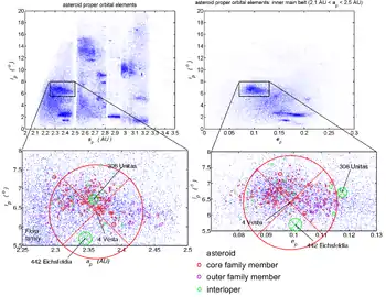 Cette famille comprend, en plus de Vesta, des astéroïdes de moins de 10 km de diamètre. Les plus brillants, (1929) Kollaa et (2045) Pékin, ont une magnitude de 12,2.