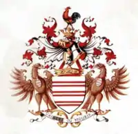 1888 : « d'argent, à trois jumelles de gueules. L'écu surmonté de la couronne de vicomte pour le titulaire, et pour les autres descendants d'un heaume d'argent, grillé, colleté et liseré d'or, doublé et attaché de gueules, aux bourrelets et lambrequins d'argent et de gueules. Cimier : un coq au naturel, crêté, barbé et membré de gueules. Supports : deux aigles au naturel, portant suspendu au cou un médaillon aux armes de la famille. Devise : « Vaincre ou mourir. »